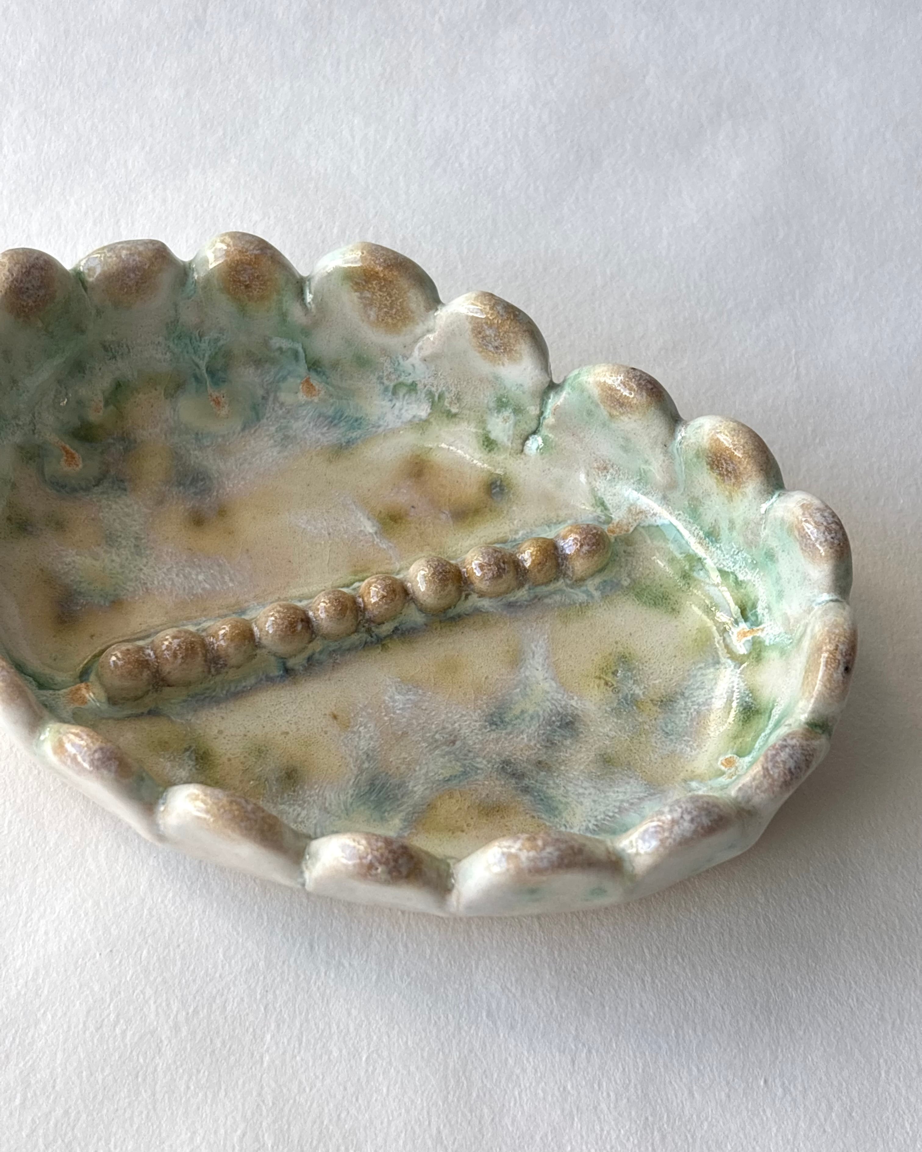 色々な釉薬を重ねて二度焼成し、翡翠のような、オパールのような不思議な表情が生まれた小皿です。淡くゆらぐ優しいリズムを楽しめます。