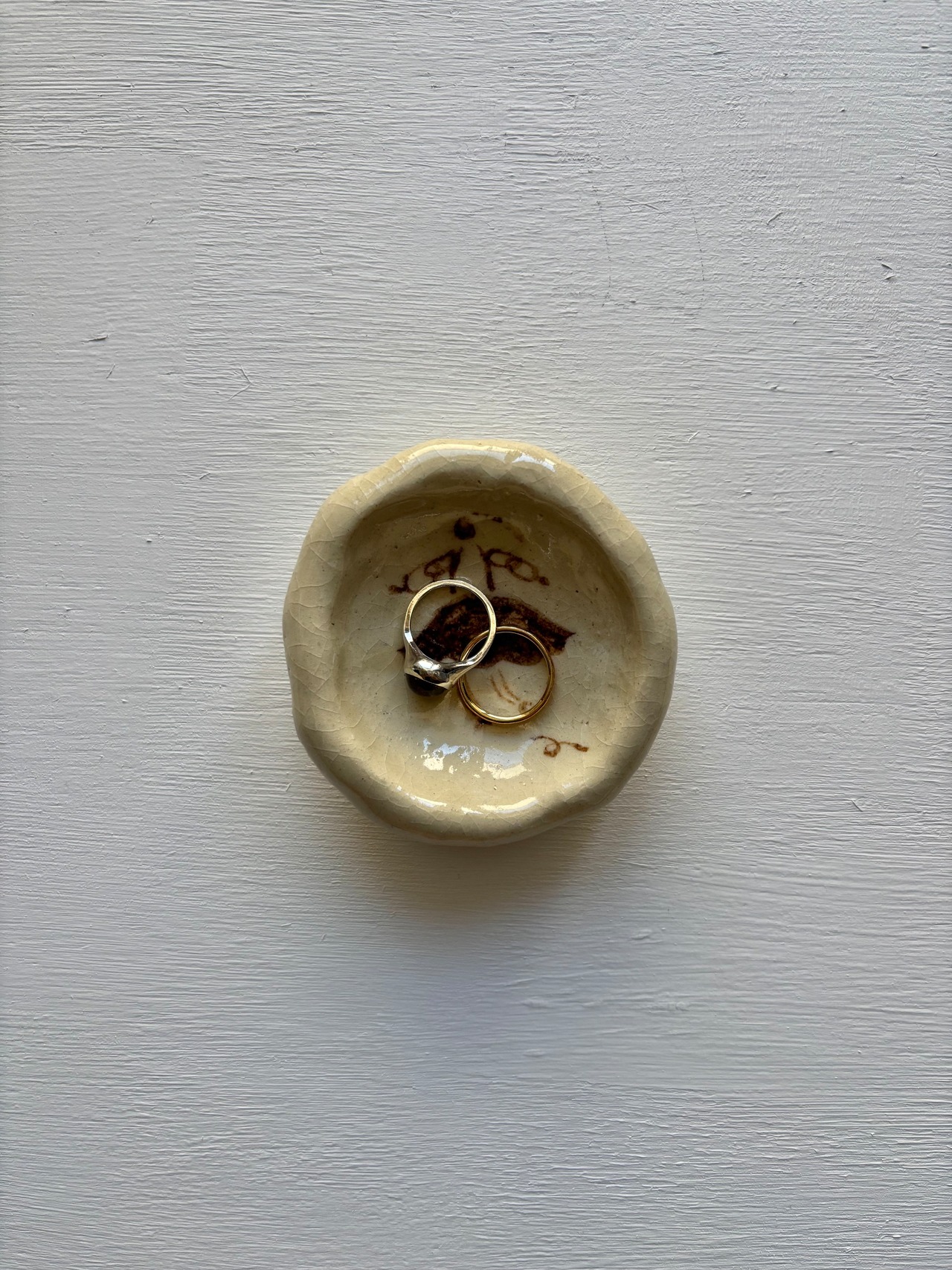 つぶつぶの荒めの粘土のざらざらした手ざわりは風合いがあってお気に入りです。二酸化マンガンで絵を描いたので、滲みや濃淡に奥行きがあってきれいです。