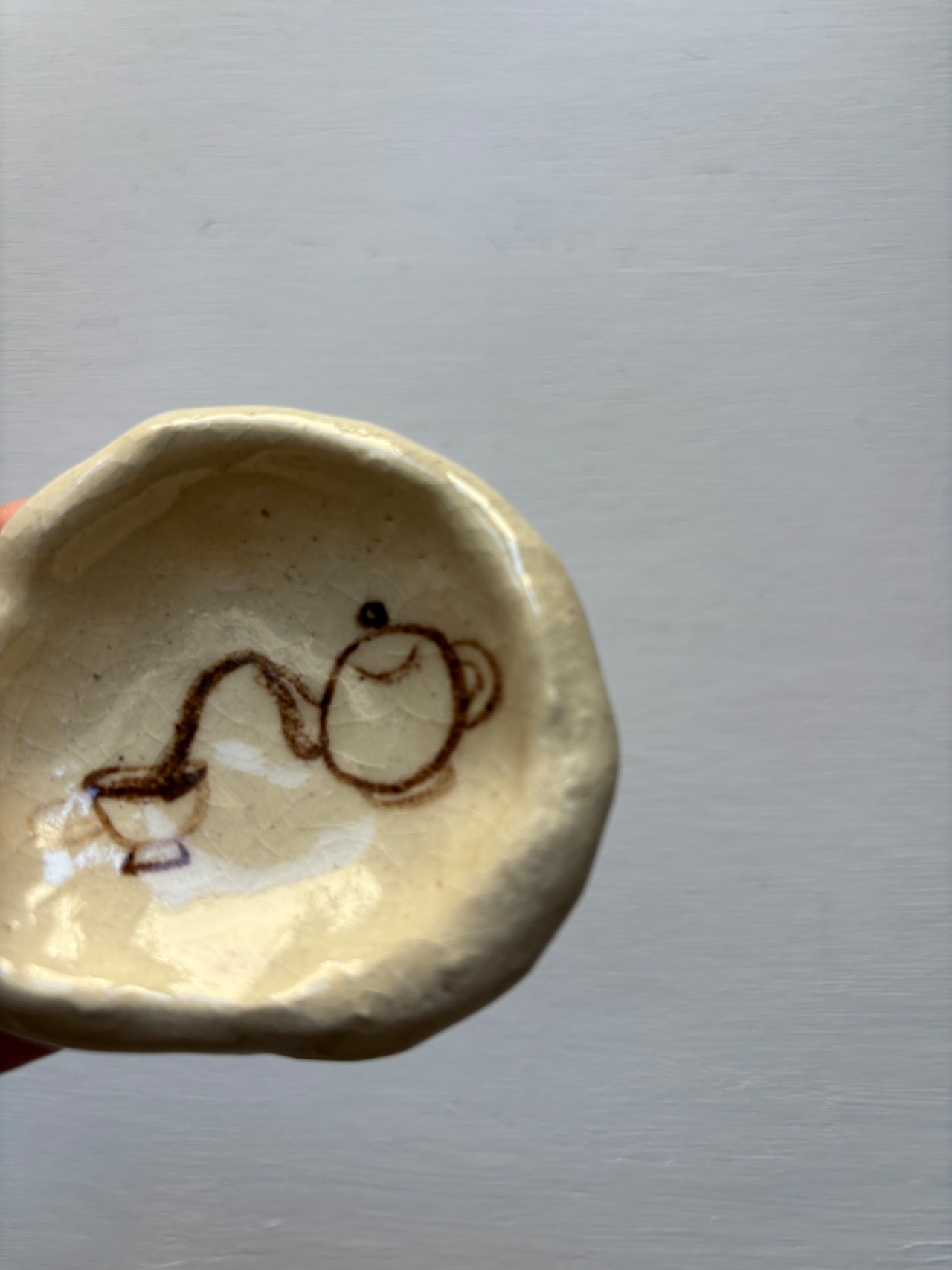 つぶつぶの荒めの粘土のざらざらした手ざわりは風合いがあってお気に入りです。二酸化マンガンで絵を描いたので、滲みや濃淡に奥行きがあってきれいです。